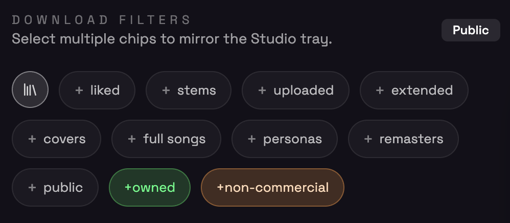 Toggle Liked, Stems, Non-Commercial, +Owned, Personas, Covers and more with multi-select chips that mirror the Studio tray.