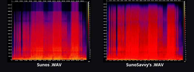 I knew we had to grab the .WAV files for your songs but the time it takes on Suno is a pain in the ass so, it got me thinking, why does it take so long on Suno in the first place? It's not because they have to summon the magical .WAV fairies from a distant .WAV warehouse to go fetch your .WAV's. It's because they're taking the MP3 and turning it into a .WAV, and if you know anything about audio, that's not good. MP3's are compressed and they lose a lot of data. Anything above 16,000 Hz is pretty much gone forever. Suno did try to make it seem like they're giving you a quality .WAV file, but it's artificial and not even artificial intelligence. I can't blame them though because most other platforms that offer .WAV downloads do the exact same thing. So it's not new. If you've downloaded a .WAV from Suno, then you know the size difference is pretty drastic. For them to store 45 billion 75mb files is a lot different than storing 45 billion 3mb files. So instead of scratching my head or beating it against the wall, trying to download all of the songs in the Suno .WAV format, I figured we could do it better than Suno. And that's exactly what we did! The image above is the original MP3 file downloaded from Suno. Below, are the two images of the resampled .WAV's. The one on the left is Suno's, and the one on the right, is our .WAV file. You can see how much cleaner ours is above the 16,000 Hz shelf. Don't believe me? Try for yourself. These Spectrogram sweeps showed Suno's “WAV” stops cold at ~16 kHz, then overlays faint synthetic highs to fake resolution. We rebuilt the pipeline so the highs are real, not painted on.
