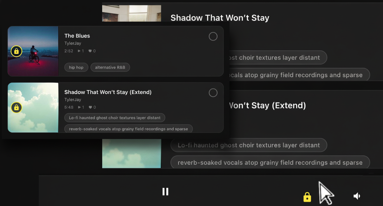 Locked tracks show up in their own tab on the left, so you can quickly grab the final versions youâve committed to, separate from your general likes.