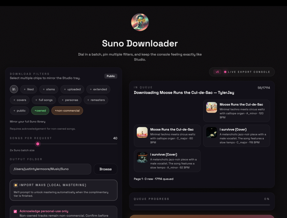 Suno Downloader mirrors your complete Studio library, layers filters like +Owned & Personas, and builds a provenance bundle for every clip before you can say “dial in a batch”.